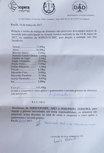 Recibo da entrega dos alimentos arrecadados a